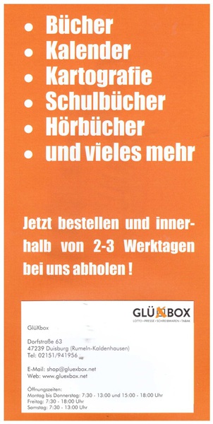 Mit unserem Besorgungsservice für Bücher, Kalender, Schulbücher, Hörbücher und vielem mehr*, bieten wir Ihnen eine attraktive Dienstleistung für Rumeln-Kaldenhausen an. Wir haben Zugriff auf über 400.000 Titel. Sie erhalten die bestellte Ware innerhalb von 2-3 Tagen. Sprechen Sie uns an!